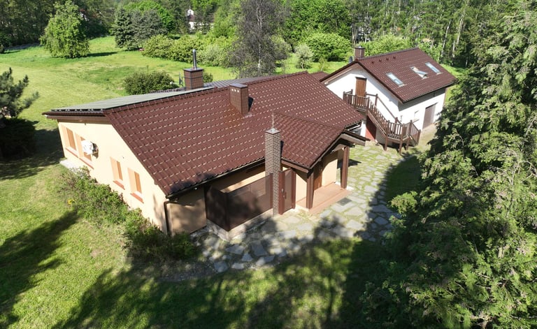 Nieruchomość o powierzchni 200m2 w bryle budynku posiada garaż jednostanowiskowy. Dom posadowiony jest na działce o powierzchni 1000m2. Obecni właściciele dużą uwagę zwrócili na ogród. Jest on niezwykle zadbany z licznymi nasadzeniami tj. tuje, drzewa sosnowe, hortensje. Gęsta roślinność zapewnia niezwykły klimat oraz daje poczucie mieszkania przy samym lesie.